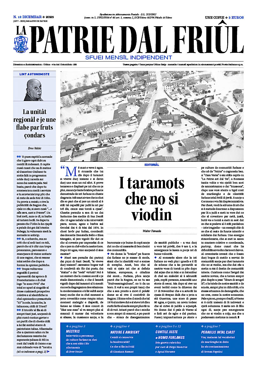 Dicembar 2025 |||| L'EDITORIAL. I taramots che no si viodin / L(INT) AUTONOMISTE. La unitât regjonâl e je une flabe par fruts çondars / PAGJINE 2 - GLOSSARI DE SOSTIGNIBILITÂT. Rigjenerazion naturâl - Rinaturalizzazione - Rewilding / INT DI CJARGNE. “Tornâ a Darte”: une opare musive par ricuardâ la poete Gina Marpillero / PAGJINE 3 - MESTRIS. Par no pierdi la memorie. «Il gno mestri di furlan al è stât il popul». Interviste cun Mauro Tosoni / PAGJINE 4 - NATURE E AMBIENT. Cemût si conservie la biodiversitât? / PAGJINE 5 - CONTILE JUSTE. La “Piçule Patrie” inventade di D’Annunzio par soterâ la nestre storie / LA PIÇADE. Joi ce ben, la Union Valdôtaine… / AUTONOMIE. La Val di Aoste no si plee ai partîts talians / PAGJINE 6 - METEO FUFIGNIS. Ploiis mai regjistradis inte storie, chês coladis su Cormons e Vierse / ULTIME DOMENIE. Filâi sore, al Nadâl / NÔ E I ARBUI. Il nestri esempli / PAGJINE 7 - UN CJANT SU LA EMIGRAZION. Viaç ae scuvierte di memorie e identitât tra i furlans di Uruguay e Argjentine / PAGJINE 8 - FRIÛL EUROPE. Bretagne, dal dirit ae “tilde” al dirit al non e ae lenghe / SLOVENIE & CRAVUAZIE. ‘No’ dai slovens al suicidi assistût / GURIZE CAPITÂL. Morelli e storie di une Contee puint fra lis regjons / PAGJINE 9 - PERAULIS INTAL CJAST. Mangjâ… cul mont parsore de taule / I LIBRIS SIMPRI BOGNS. Renzo Balzan (Edelweiß), Poesiis e Liendis daûr la Crete dal Serenât, Pasian di Prât, 2007 / PAGJINE 10 - STORIE E MEMORIE. Personalitâts furlanis pal an che al ven inte rubriche artistiche di Itineraria / PIRULIS DI STORIE E MUSICHE. I Concierts di Sant Martin in Cjargne vie pal mês di Dicembar / PAGJINE 11 - SPORT… CHE TI TRAI! Lis aventuris par dut il mont dai oms di fier cul cûr in Friûl | Lâ a cirî il limit personâl: un atlete in lote cuintri se stes | Une zornade a scuele: testemoneancis e tancj fatarei di contâ / ART TAL TAC. No Good meets Passion: il Friûl che si môf, che al cambie e che nol à pôre di mostrâsi a SUNS Europe 2025 / PAGJINE 12 - HOMO FURLANUS. Ritrat de “Foemina Furlana”, no agnul dal fogolâr ma buine di plasmâ la identitât de nestre Matrie / CUNGJÒ. Nus à lassâts il professôr Nereo Perini. ||