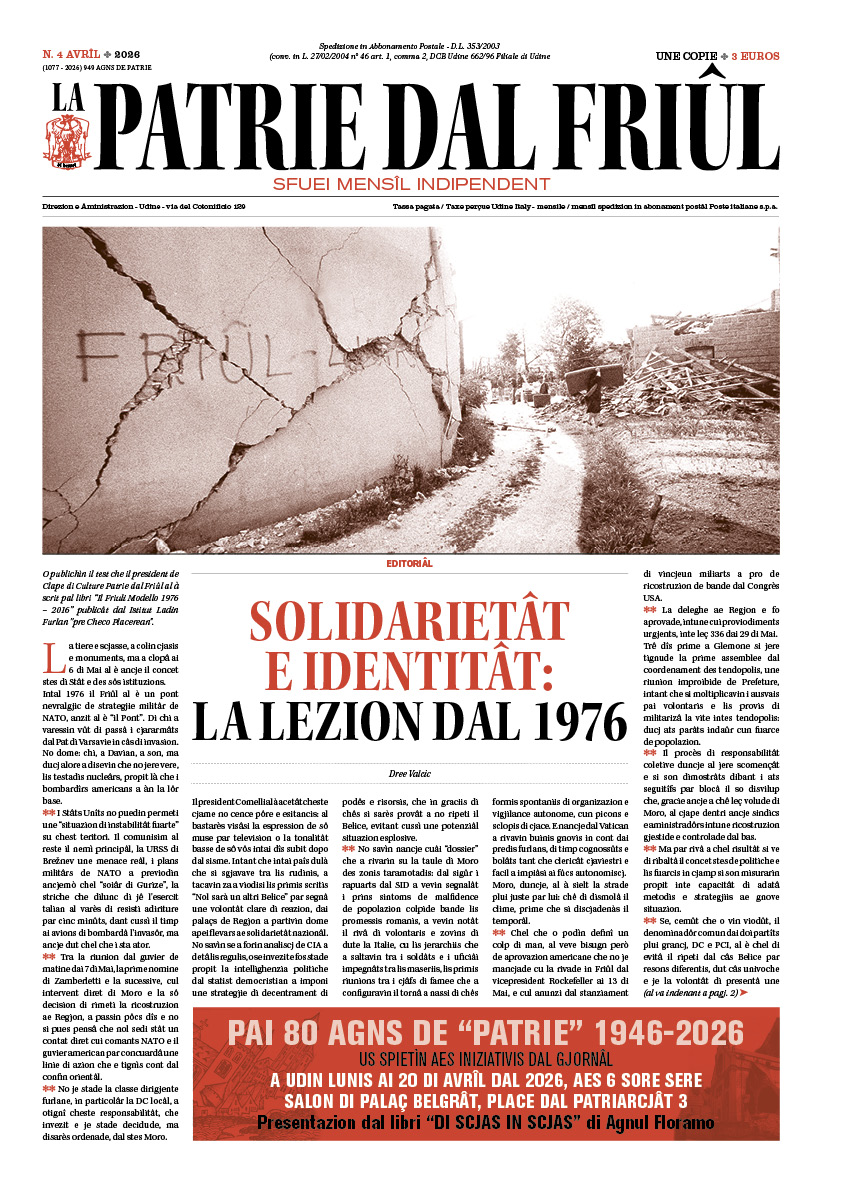 Zenâr-Fevrâr 2026 |||| L'EDITORIAL. Furlanofobie: un mâl che al ven di lontan / L(INT) AUTONOMISTE. Cambiìn lis cjartis in man di une Regjon mai nassude / PAGJINE 2 - METEO FUFIGNIS. I nûi, e il misteri che ju mude in ploie / INT DI CJARGNE. La sfide di Rebecca: fâ cressi la famee e une aziende su pes monts / PAGJINE 3 - MESTRIS. Par no pierdi la memorie. «La fuarce dal teatri e je doprâ la lenghe di ogni dì, ce isal di plui furlanist?». Interviste cun Paolo Patui / PAGJINE 4 - CARNEVÂL. Lis mascaris di Ravinis, un tesaur di difindi / UNE PERAULE. Omenut di aghe / MEMOREANT IL TARAMOT DAL 1976. Glesie Furlane: incuintris par no dismenteâ / PAGJINE 5 - TROI CELEST. 1 PROLIC. Un percors di famee su pal Troi di Aquilee / LA PIÇADE. Leo Zanier tal Borc dal Soreli: un pataf al furlan… / AUTONOMIE. La Val di Aoste no si plee ai partîts talians / PAGJINE 6 - GURIZE CAPITÂL. La nassite di une gnove Arcidiocesi / PREDIS TAL TARAMOT. Pai sîs di Mai, mi plasarès… / LA RASSEGNE. Colonos: “In File” par rifleti su “un paîs di maseriis e di primulis” / PAGJINE 7 - PERAULIS INTAL CJAST. Un jutori naturâl par tacâ ben l’an gnûf / DI CÀ O DI LÀ DA LA AGHE? Ce isal di là dal Tiliment? / PAGJINE 8 - FRIÛL EUROPE. La Groenlande inte smicje dai USA. Une ocasion par infuartî il so autoguvier e ancje la Europe? / SLOVENIE & CRAVUAZIE. Sui euros in monede nissune scrite taliane / PAR UNE BIBLIOTECHE NAZIONALITARIE. I tescj di fonde par capî la identitât di un popul / PAGJINE 9 - SPORT… CHE TI TRAI! Riccardo Sironi, un citadin dal mont cun il cûr in Friûl e passion di no crodi par la bale ovâl | Daspò dal “Bau” dal 2000: une clape par cjalâ indenant e puartâ la passion pe bale ovâl pardut, massime ai plui zovins | Mês di “tag rugby” tes scuelis e, ai 27 di Avrîl, la zornade conclusive a Vile Manin / PAGJINE 10 - INOVÂI. An gnûf par memoreâ chei che a àn fat la musiche in Friûl / PIRULIS DI STORIE E MUSICHE. Desideris musicâi pal an a pene scomençât: la musiche furlane e merete di plui / PAGJINE 11 - SUL PALC IN MARILENGHE. Il Teatri Stabil… si stabilize / ART TAL TAC. Tofugate: une fuide moderniste jenfri orient e ocident / I LIBRIS SIMPRI BOGNS. AA.VV. Continus, storiis di vite dai nestris nonos, Palme 2011 / PAGJINE 12 - IL FRIÛL CHE AL CJALE A SORELI A MONT. Pordenon, capitâl no taliane de culture di un Friûl crosere de Europe. ||