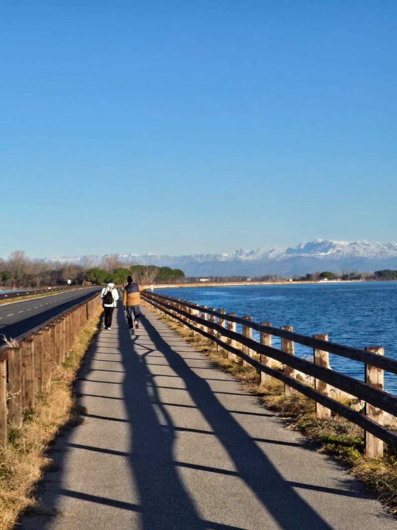 ◆ I Troi di Aquilee al passe su la piste ciclabile a ôr de strade che e scjavace la marine e che e lee la isule di Grau a Belvedè come il fîl di un acuilon. A drete e a çampe e je aghe e, plui che si è tal viert, plui e tire la buere cence padin. Cumò che al tache a sclarî, si viôt la lagune dute ingrispade dal aiar, si nase odôr di salât, si sint il scriulâ dai cocâi. Mê femine e mê fie a àn frêt. Bodifate che al tache a cricâ il soreli de bande di Barbane. No podìn no fermâsi e contemplâ il spetacul. O jerin incjantâts. La aghe e someave di arint e il soreli, che al jevave biel planc daûr dal Cjars, si spieglave su la aghe tirant une cumiere rosse infogade. Si sin cjalâts in muse. O jerin dûrs di frêt ma i nestris voi a mostravin une contentece grande par vê inviade cheste aventure.