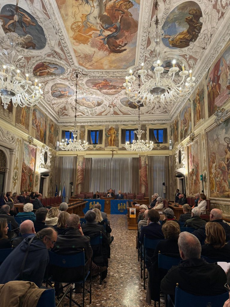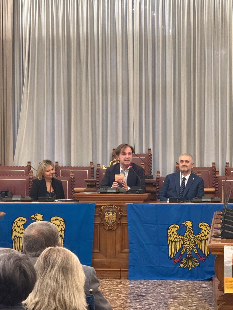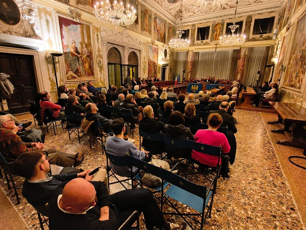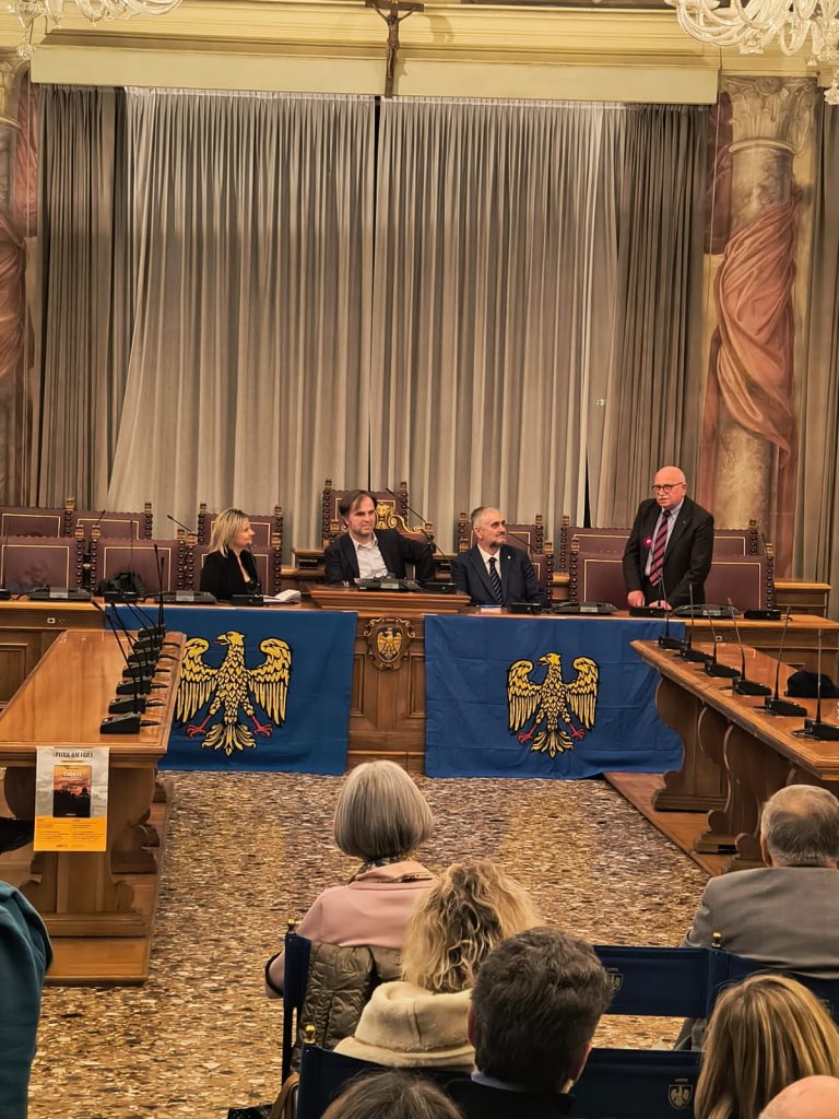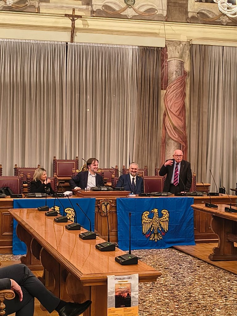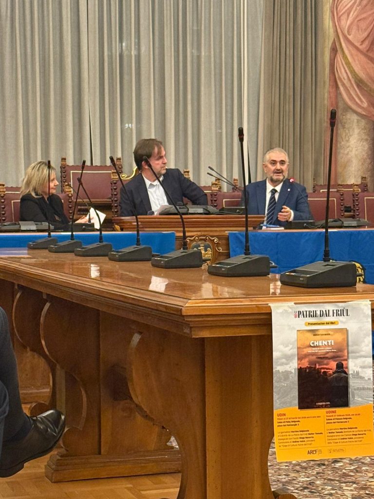 La prime des iniziative pai 80 agns de “La Patrie dal Friûl” (1946-2026). O vin presentât ai 27 di Fevrâr tal Salon di Palaç Belgrado di Udin, il gnûf libri, “CHENTI” romanç furlan di Diego Navarria. A son intervegnûts la gjornaliste Martina Delpiccolo e il diretôr da La Patrie dal Friûl Walter Tomada, l’autôr Diego Navarria cun lis conclusions di Andrea Valcic, president de Clape di Culture “Patrie dal Friûl. Te foto la grand partecipazion di public.