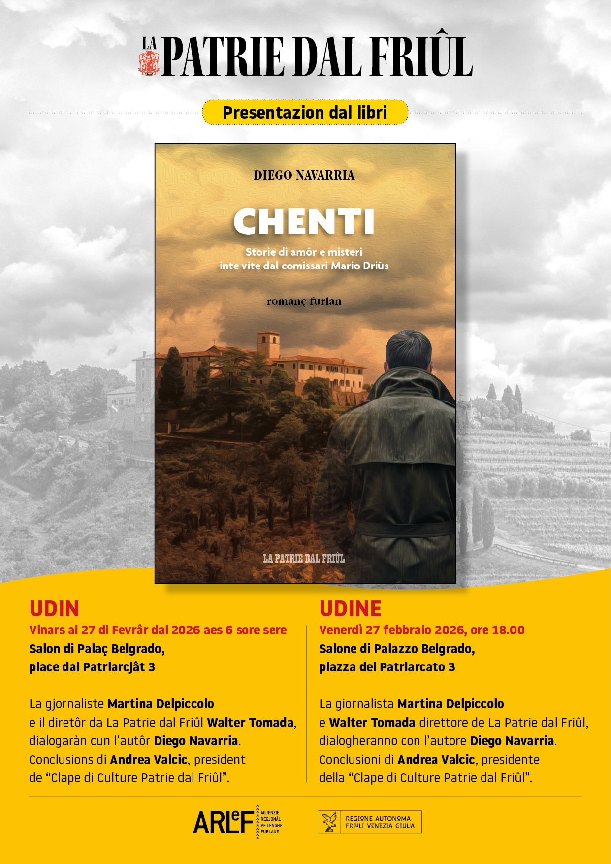 PAI 80 AGNS DE “PATRIE” 1946-2026. La prime des iniziativis. Presentazion dal gnûf libri, “CHENTI” romanç furlan di Diego Navarria. Vinars ai 27 di Fevrâr dal 2026 aes 6 sore sere Udin, Salon di Palaç Belgrado, place dal Patriarcjât, 3. A intervegnin: la gjornaliste Martina Delpiccolo e dialogarà cul diretôr da La Patrie dal Friûl Walter Tomada ae presince dal autôr Diego Navarria. Conclusions di Andrea Valcic, president de Clape di Culture “Patrie dal Friûl. Us spietin!