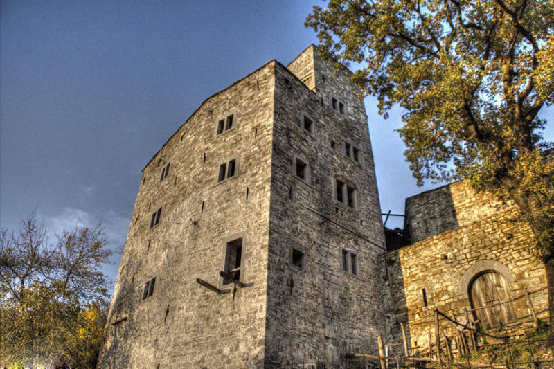 ◆ Dopo vê passât il cjistiel di Çuc, e viodût te gleseute il biel afresc dal Tresinte cu la Madone che e da di lat al Bambin Jesù tal mieç di Sant Zuan e Sant Jacum, la briade e rive, dopo scuasit une ore di sudade, su la puarte dal cjistiel di Cucagne, fuart e imponent sul colm di une alture. Ur da il bon acet l’architet, il paron di cjase, che al ufrìs a ducj aghe frescje e al spieghe la storie e la struture dal cjistiel. “La part plui antighe dal cjistiel al è il palaç vieri sdrumât, che a restin dome i mûrs, e la torate, une vore alte e ancjemò in pîts. La puarte par jentrâ e je ancjemò a cetancj metris di altece: e coventave une scjale lungje di len che e vignive tirade sù par difese. Cheste part e je stade fate sù dopo dal an Mil, su lis fondis di fortificazions romanis. Dopo – al va dilunc l’architet – cu la incressite di numar e ancje di podê de famee di Cucagne, une des plui antighis e autorevulis de Patrie dal Friûl, a àn fat sù cheste cort dulà che o sin, cun ator la gleseute di Sant Jacum, la cistierne pe aghe e altris ambients pe guarnigjon e pe servitût. Tal secul diesim cuart, par vê une abitazion plui comude, la famee e à zontât il grant palaç di cuatri plans cui siei salons, dulà che dopo o larìn a cenâ. Il restaur al è stât fat ancje cun seminaris di architeture de Universitât dal Friûl, dulà che tancj zovin a àn lavorât par putrops Istâts. Cjalait – al zonte il paron di cjase – che no ai volût vê la strade, che si à di rivâ a pît, ni lûs, che o doprìn cjandelis, ni aghe, che par bevi se puartìn sù pe schene o cul mus!” “Jessi intun puest cussì – e confide Ane ai amîs – nus mene indaûr. Mi somee di jessi te Ete di Mieç.” “Vere – al concuarde Nino, simpri sensibil a ce che e dîs Ane ma ancje al so stomi – ma cumò lin a cene, che nus clamin.”